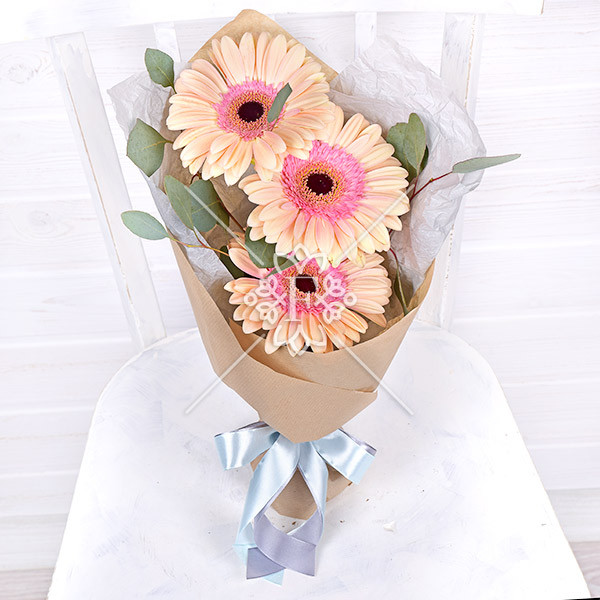 Гербера розовая – 3 шт., эвкалипт – 1 шт., упаковка, лента.
